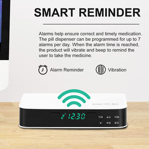 It has an alarm clock that can be programmed to sound alarms. The smart pill box will buzz and beep to remind you to take your medicine when the alarm time is up.